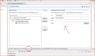 Proje oluştuktan sonra sizi karşılayan ekrandan "Extensions" tabına gelin , burada ekranın sol tarafındaki "All Extensions" panelinden org.elipcse.ui.actionSets sekmesini aşağı genişleterek (menu) 'yu bulalım. Sağ taraftaki Extension Element Details'den menu ismini değiştirelim. (ok la gösterilen yerde "label" textfield'inde yazılan "Sample&Menu" yerine yazacağız )
