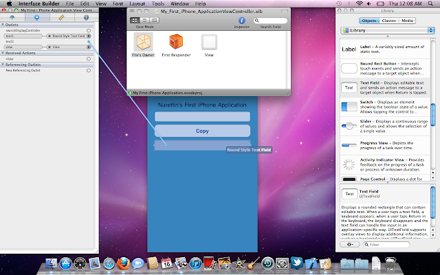 Tanımlamalar bitti :) Ve görsel kısma geçiyoruz. Resources klasörünün altındaki My_First_iPhone_ApplicationViewController.xib (nib diye okunuyor) dosyasına çift tıkladığımızda Xcode'un Interface builder kısmı açılacaktır.